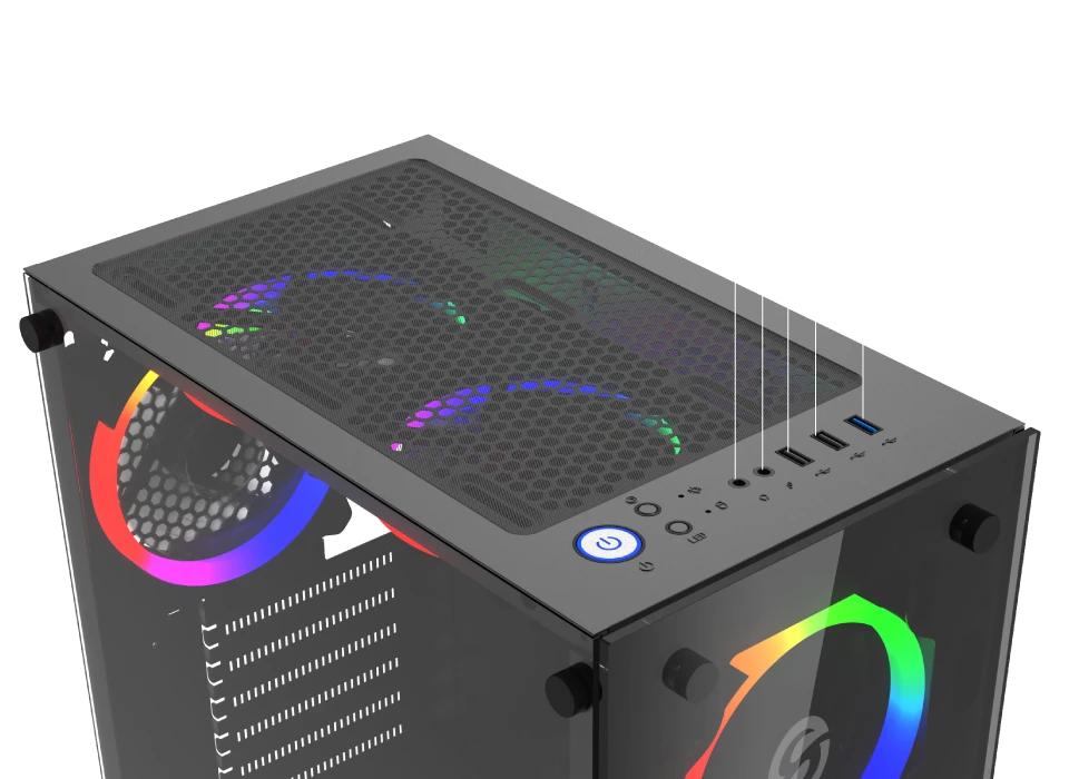 Este gabinete cuenta con múltiples puertos USB y de audio estratégicamente ubicados para facilitar la conexión de todos tus dispositivos.