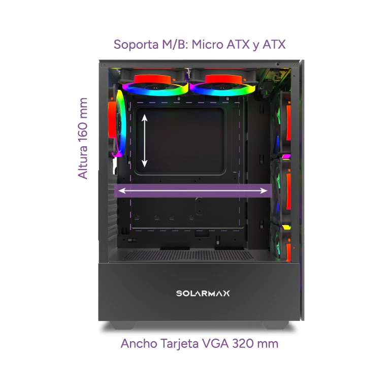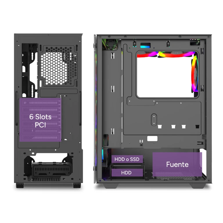 Gracias a este diseño, los componentes quedan completamente visibles, permitiendo lucir al máximo la iluminación RGB y lograr una estética moderna que se destaca en cualquier setup gamer.