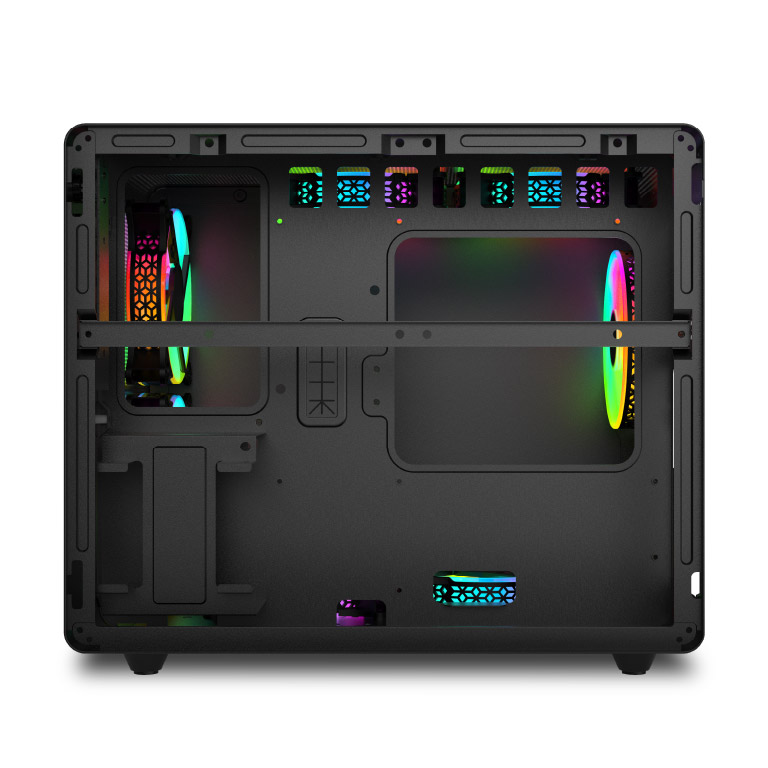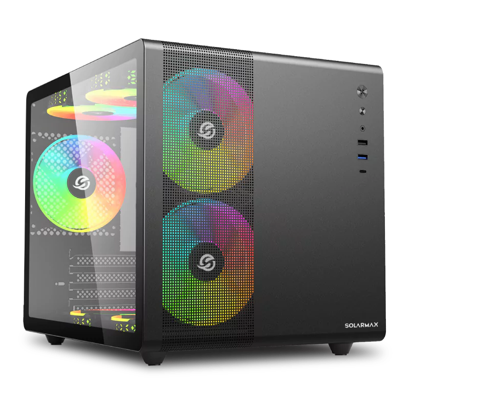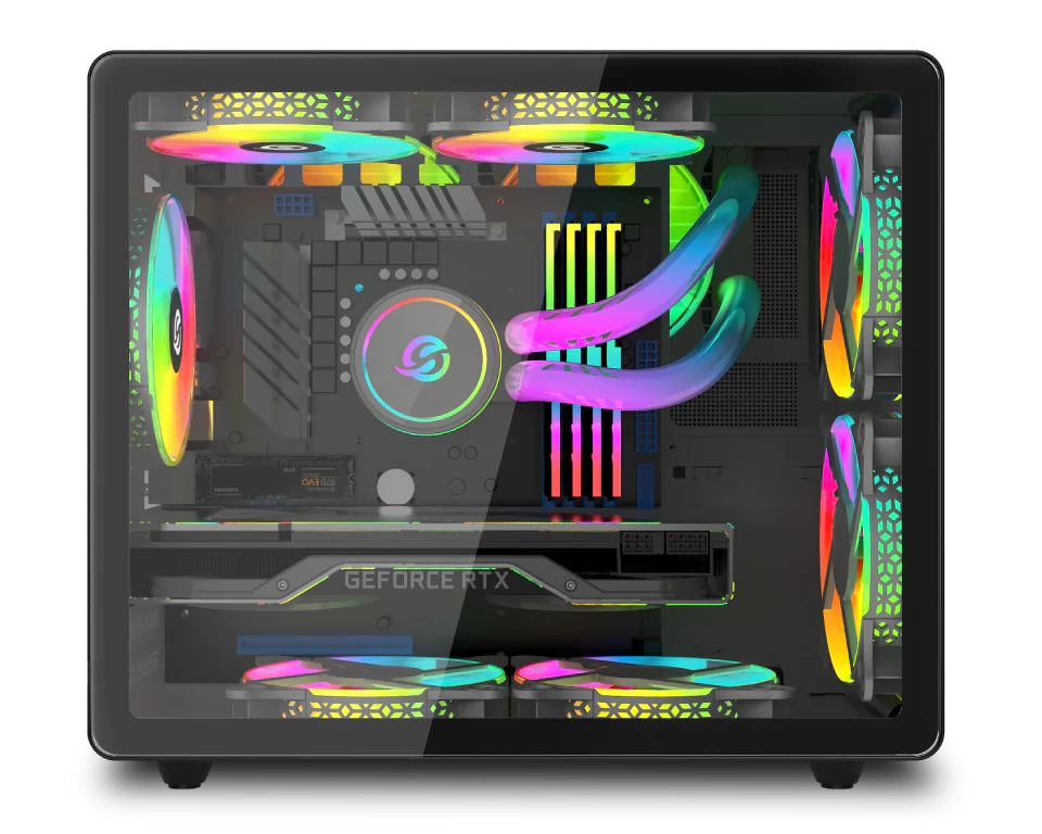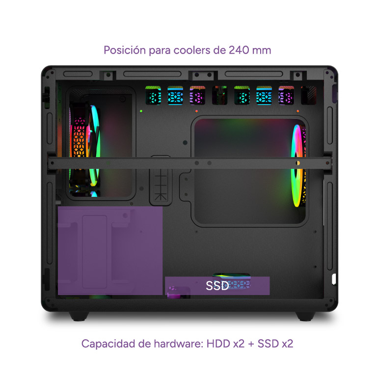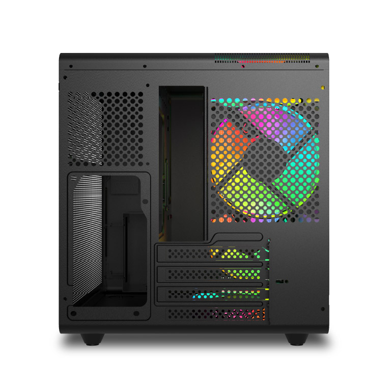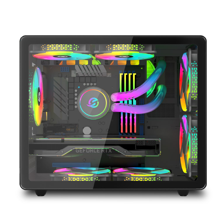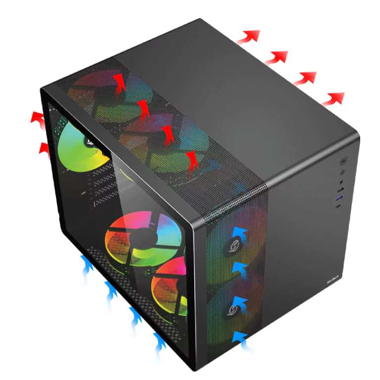 Pensado para setups ITX y Micro-ATX de alto rendimiento, este gabinete en formato cubo combina una estética moderna con funcionalidades avanzadas, como triple sistema de refrigeración, panel lateral de malla y una ventana completa de vidrio templado que deja ver el poder de tu equipo.